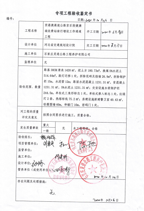 京港澳高速公路京石段健康城收費(fèi)站南行增設(shè)工作通道工程驗(yàn)收鑒定書