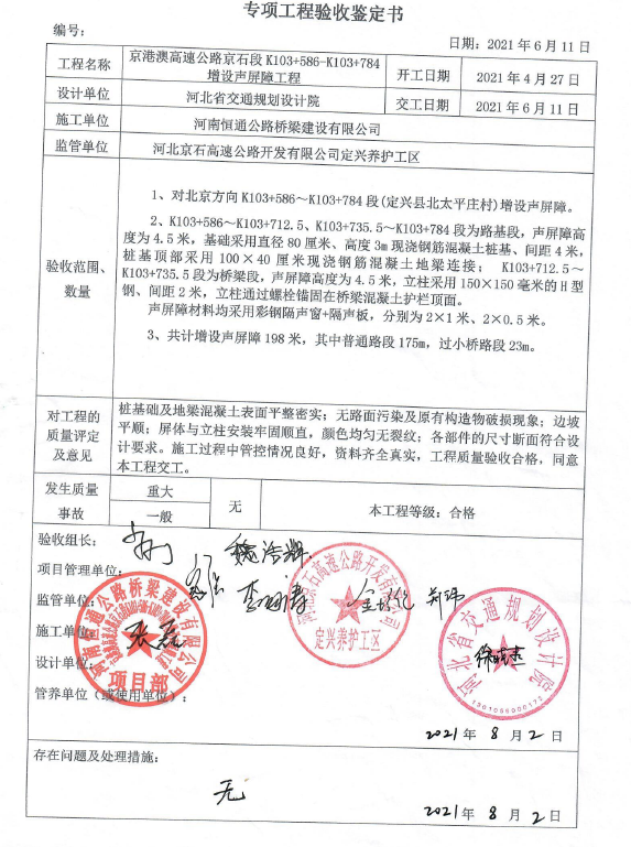 京港澳高速公路京石段K103+586-K103+784段增設(shè)聲屏障工程驗(yàn)收鑒定書(shū)