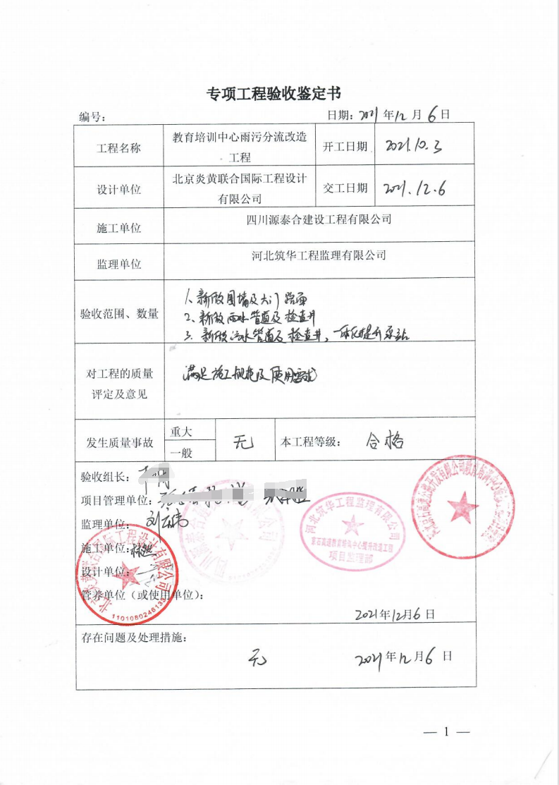 河北京石高速公路開發(fā)有限公司教育培訓(xùn)中心雨污分流改造工程竣工驗(yàn)收